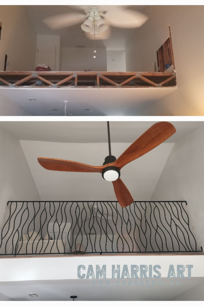 Davidson North Carolina – for this project a client commissioned three Bent wrought iron railing pieces to replace a pony stair wall and other half walls in their home. By providing me with the stair dimensions and the angles for the stair piece I created my Bent iron art pieces to fit perfectly in their space.