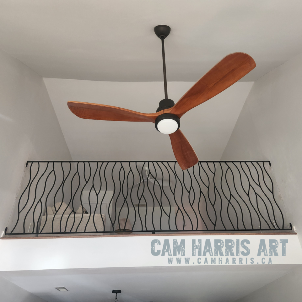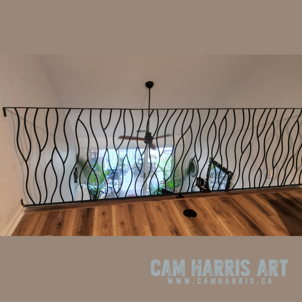 Made using a flat iron top and bottom rail it was easy to install for the client. The Bent design between the top and bottom rail is made from solid 1/2″ round mild steel, welded and blended so that each intersecting piece becomes seamless creating a solid functional iron art piece. The Bent iron art compliments the natural beauty of the wood posts, trim and stairs. It is finished in a powder coat for long lasting durability and beauty.