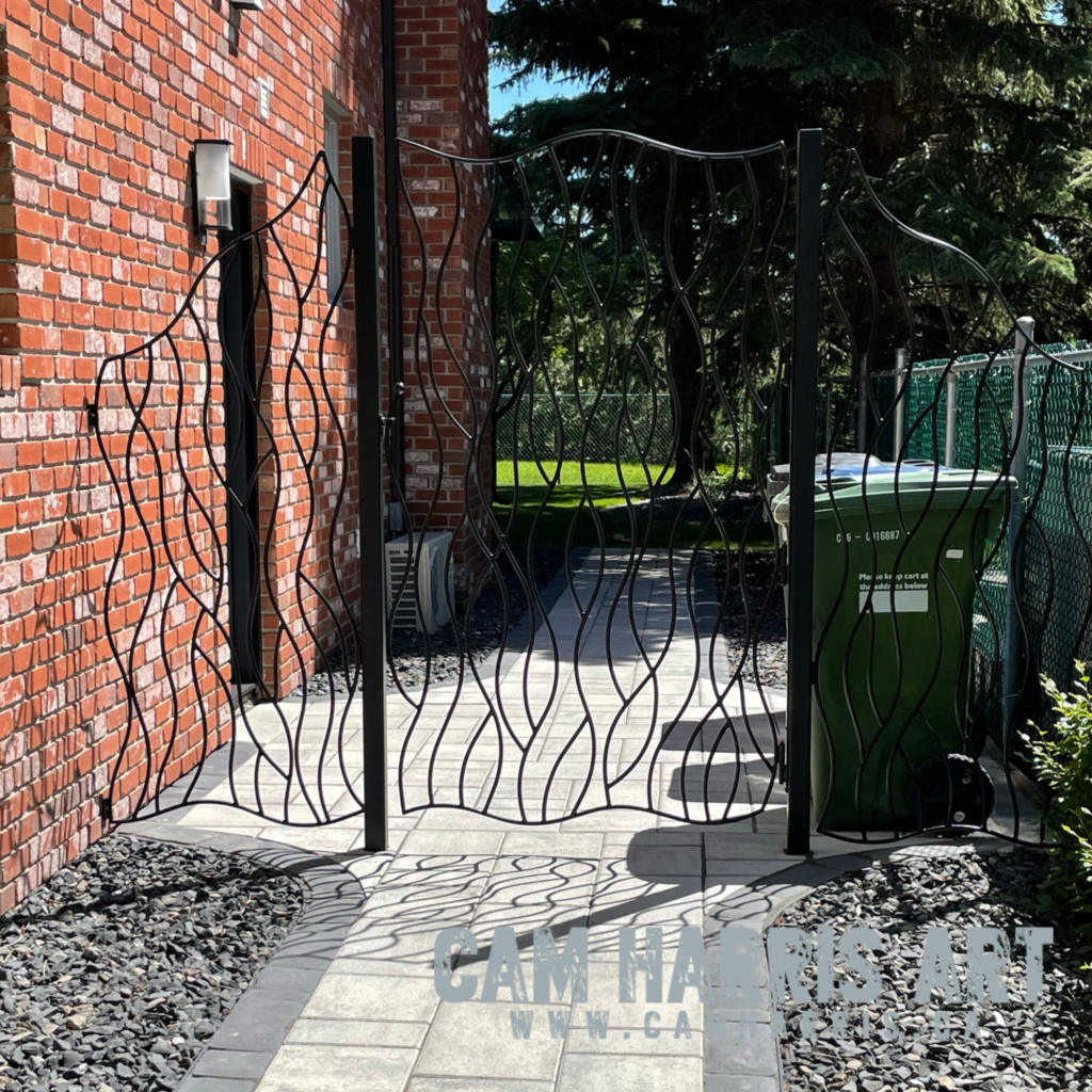 These wrought iron gate and fence pieces are done in my signature BENT design for a client in Calgary, Alberta. The 10 foot long posts were put in the ground and secured with poured concrete first. Once they were set then the live edge fence and gate were created to fit the spaces. The gate dimensions are 72″ high by 42″ wide. It has the ability to swing both inside and out.