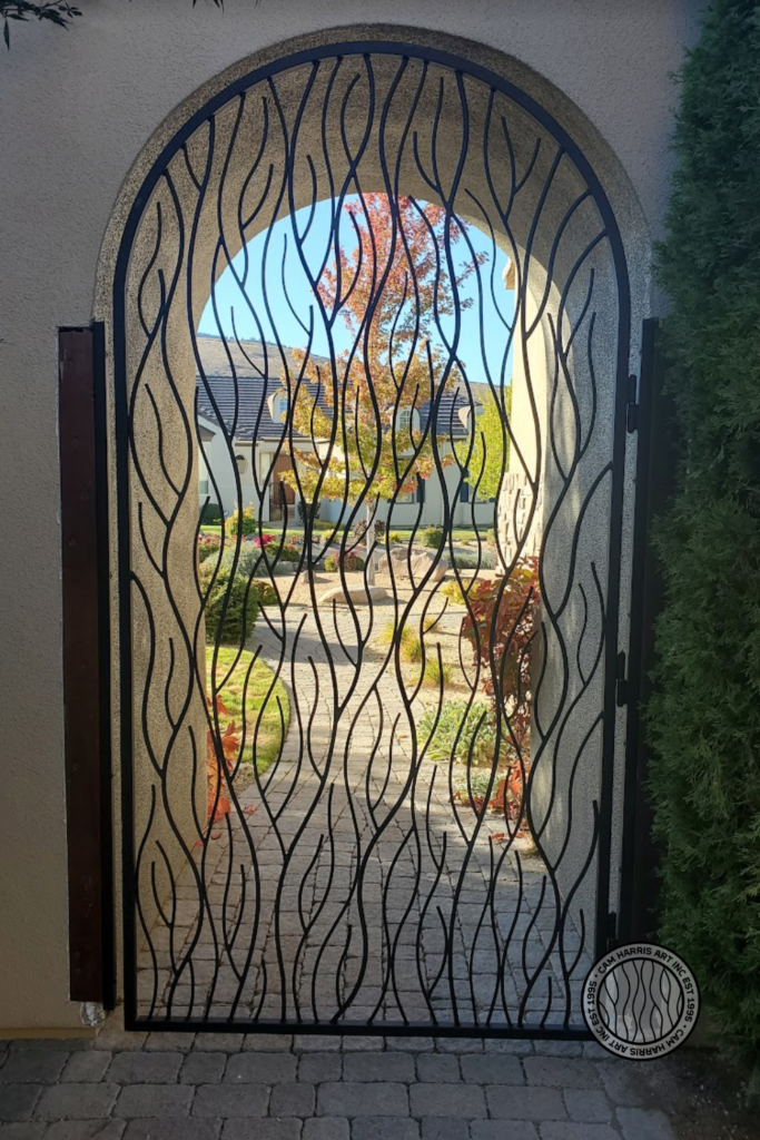 Wrought iron gate and guardrail in my Twigs Design tree branch design. This was created for a client in Reno Nevada. It is a contemporary interpretation of tree branches sculpted in steel. This metal railing is created using three different widths of solid round steel for beauty, strength, and durability.