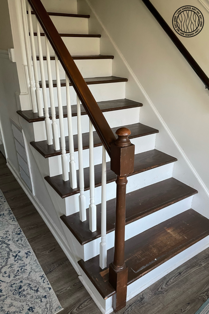 When the client contacted me about their stair railing makeover they wanted my Twigs Design metal railing as the feature part of the new fresh stair railing. Their old railing had a basic handrail and white balusters. Here is what the railings looked like before the stair railing design project began.