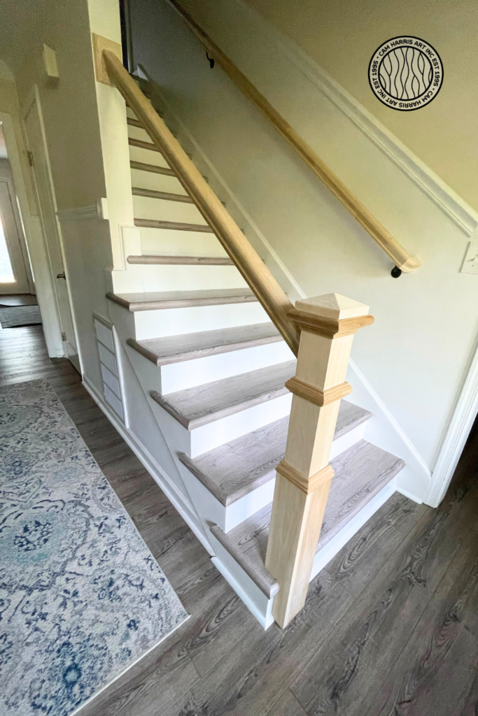 STEP 2 – Once the stair treads and flooring were replaced a new box style newel post was installed. From there a new wood handrail was also installed.