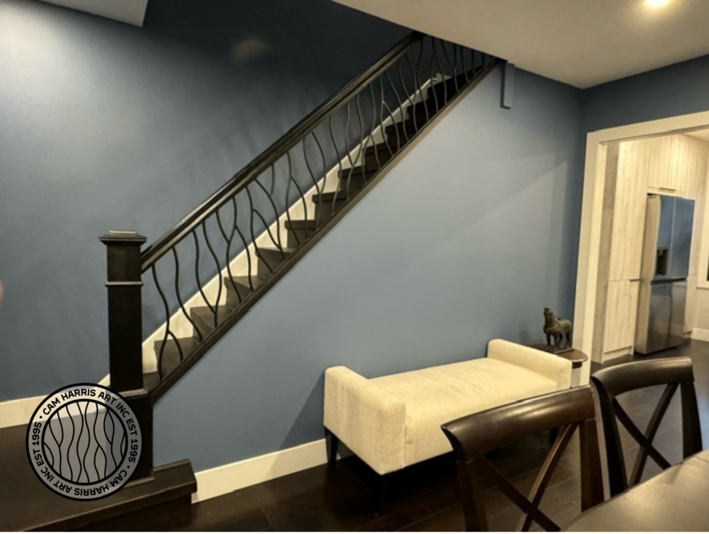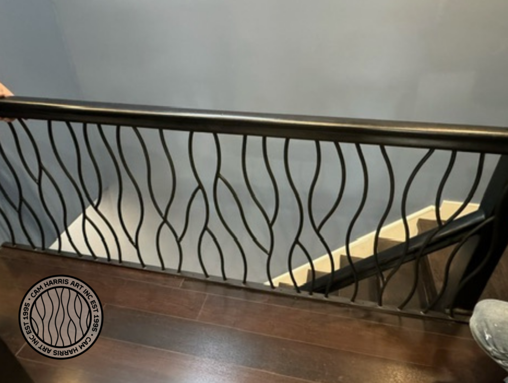 Made using a flat iron top and bottom rail it was easy to install for the client. The Bent design between the top and bottom rail is made from solid 1/2″ round mild steel, welded and blended so that each intersecting piece becomes seamless creating a solid functional iron art piece. The Bent iron art compliments the natural beauty of the wood posts, trim and stairs. It is finished in a powder coat for long lasting durability and beauty.
