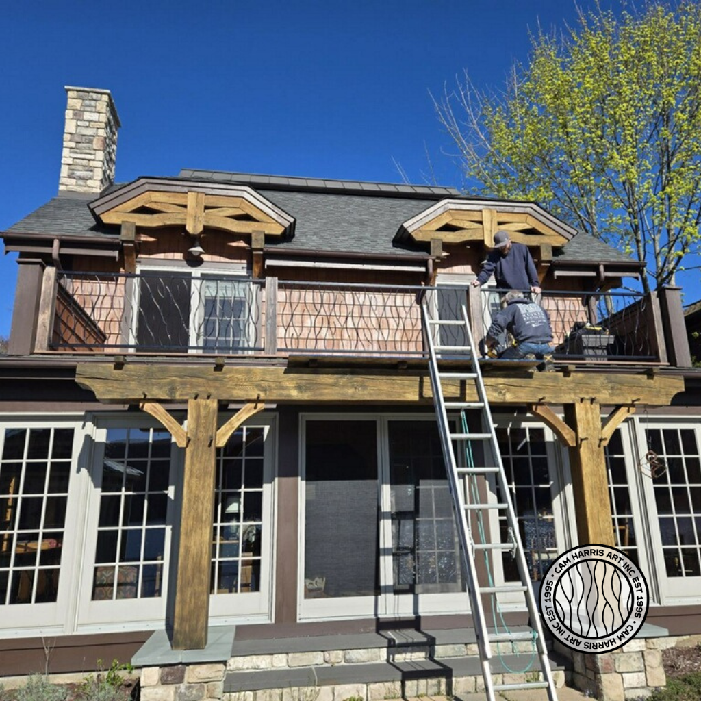 In the images you see my branch style deck railing called Twigs Design for a lakefront home in Greenwood Lake NY. My Twigs Design iron deck railing is created using three widths of solid round iron. As each piece is laid into the design it is welded in place. This begins to form the branch style look of the Twigs Design. Once all the iron piece are in place all connection points are fully welded and through layers of welds and grinding a seamless branch design is created.