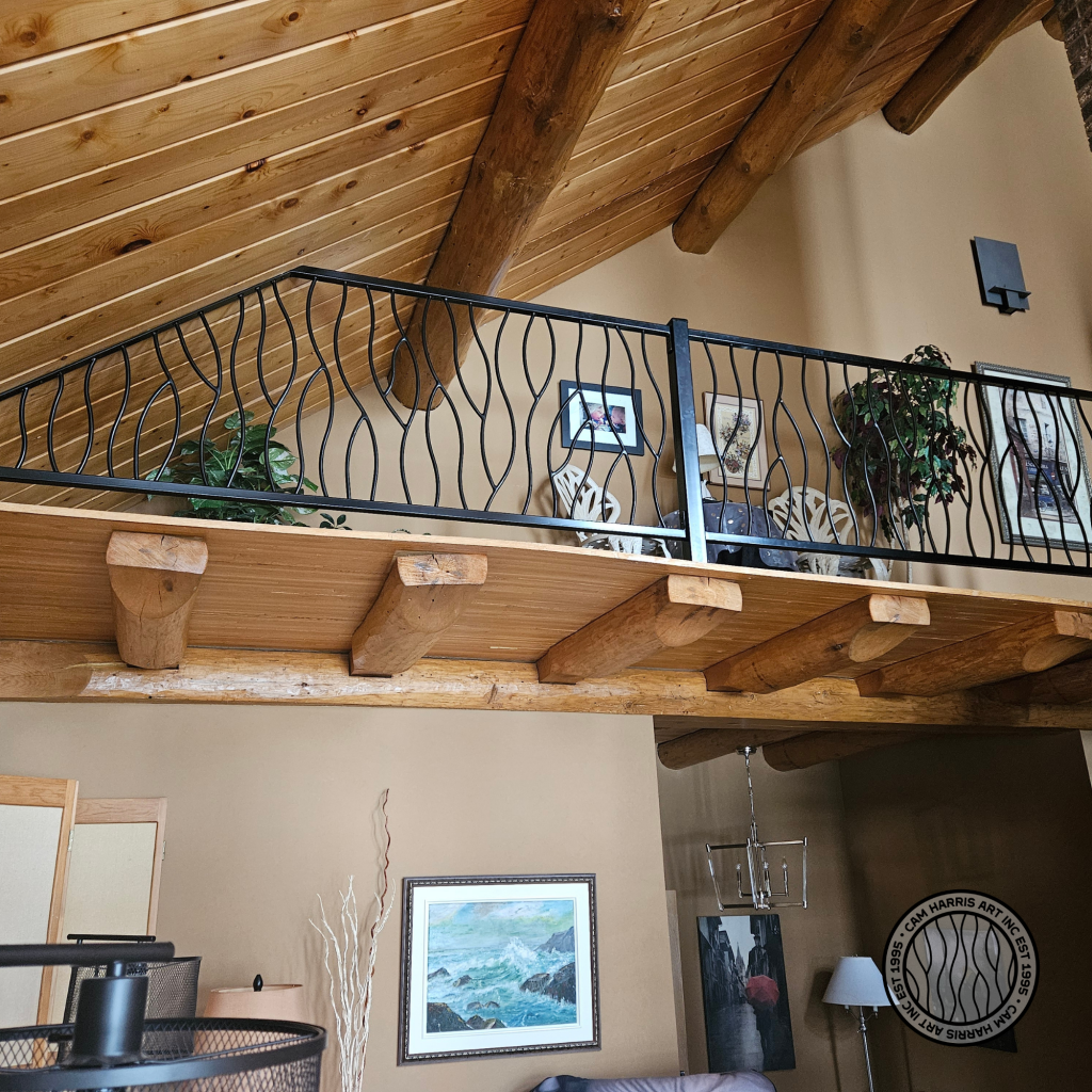 My modern iron branch style railing is the perfect style for the interior of this log home. This is my Bent Design and was created for a client in Ontario, Canada. Each piece was made in the exact dimensions needed by the client to replace their old wood railing.