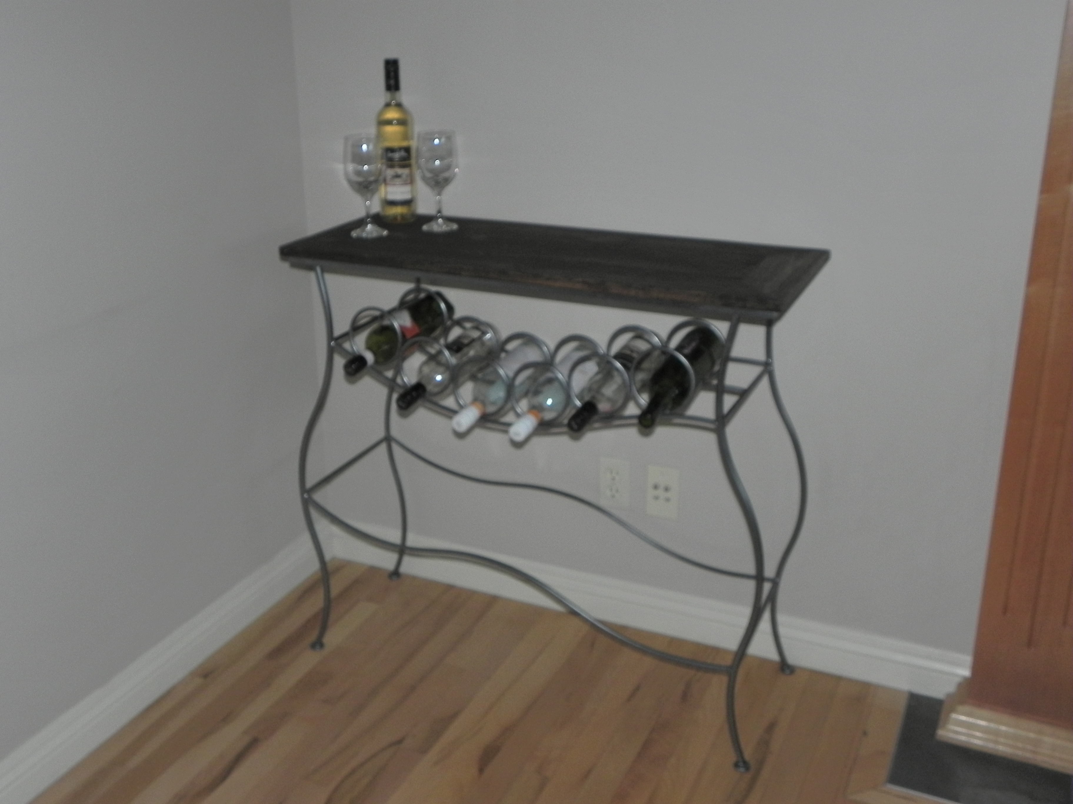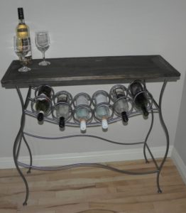 A combination of distressed pine and steel lends an elemental quality to this funky console table. Solidly built using solid iron and full welds, it’s a dramatic platform for displaying your favorite wines. We can create this same console table for you in whatever dimensions you need. The finish of the top and base are fully customized as well based on your home decor. Crafted of solid distressed pine and steel. The wood top will have variations inherent to distressed materials such as visible knots, hairline cracks and wear. Each piece is one of a kind.